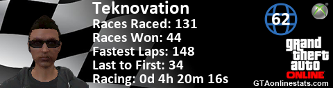 [URL=http://GTAonlinestats.com/showplayer/Teknovation][IMG]http://GTAonlinestats.com/racesignature/Teknovation/sig.png[/IMG][/URL]