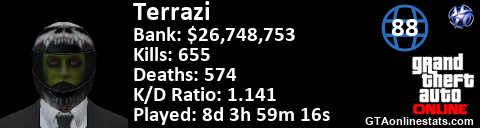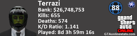[URL=http://GTAonlinestats.com/showplayer/Terrazi/2][IMG]http://GTAonlinestats.com/signature/Terrazi/2/sig.png[/IMG][/URL]
