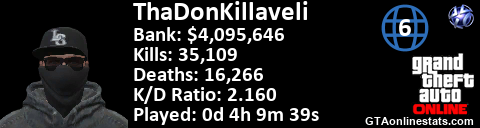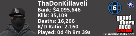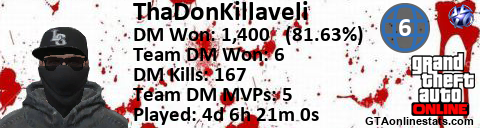 [URL=http://GTAonlinestats.com/showplayer/ThaDonKillaveli/2][IMG]http://GTAonlinestats.com/dmsignature/ThaDonKillaveli/2/sig.png[/IMG][/URL]