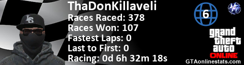 [URL=http://GTAonlinestats.com/showplayer/ThaDonKillaveli/2][IMG]http://GTAonlinestats.com/racesignature/ThaDonKillaveli/2/sig.png[/IMG][/URL]