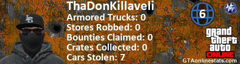 [URL=http://GTAonlinestats.com/showplayer/ThaDonKillaveli/2][IMG]http://GTAonlinestats.com/crimesignature/ThaDonKillaveli/2/sig.png[/IMG][/URL]