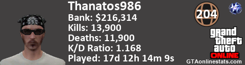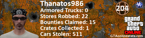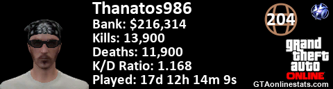 <a href="http://GTAonlinestats.com/showplayer/Thanatos986"><img src="http://GTAonlinestats.com/signature/Thanatos986/sig.png" alt="Thanatos986" border="0" /></a>