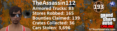 [URL=http://GTAonlinestats.com/showplayer/TheAssassin112][IMG]http://GTAonlinestats.com/crimesignature/TheAssassin112/sig.png[/IMG][/URL]
