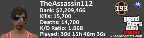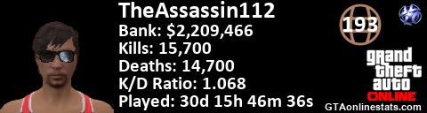 <a href="http://GTAonlinestats.com/showplayer/TheAssassin112"><img src="http://GTAonlinestats.com/signature/TheAssassin112/sig.png" alt="TheAssassin112" border="0" /></a>