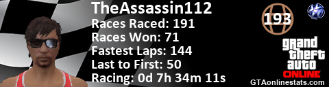 [URL=http://GTAonlinestats.com/showplayer/TheAssassin112][IMG]http://GTAonlinestats.com/racesignature/TheAssassin112/sig.png[/IMG][/URL]