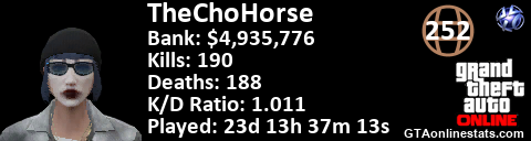 <a href="http://GTAonlinestats.com/showplayer/TheChoHorse"><img src="http://GTAonlinestats.com/signature/TheChoHorse/sig.png" alt="TheChoHorse" border="0" /></a>