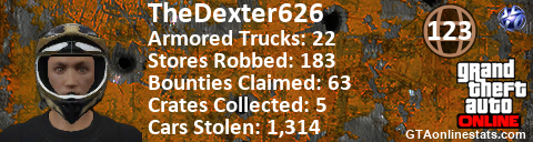 [URL=http://GTAonlinestats.com/showplayer/TheDexter626][IMG]http://GTAonlinestats.com/randomsignature/TheDexter626/sig.png[/IMG][/URL]
