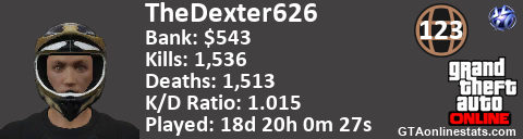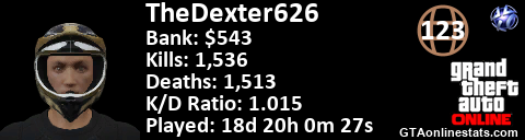 <a href="http://GTAonlinestats.com/showplayer/TheDexter626"><img src="http://GTAonlinestats.com/randomsignature/TheDexter626/sig.png" alt="TheDexter626" border="0" /></a>