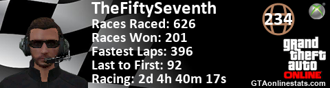 <a href="http://GTAonlinestats.com/showplayer/TheFiftySeventh"><img src="http://GTAonlinestats.com/racesignature/TheFiftySeventh/sig.png" alt="TheFiftySeventh" border="0" /></a>