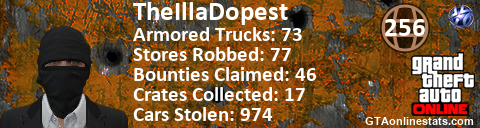 [URL=http://GTAonlinestats.com/showplayer/TheIllaDopest][IMG]http://GTAonlinestats.com/crimesignature/TheIllaDopest/sig.png[/IMG][/URL]