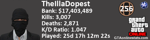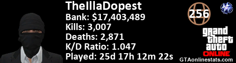 <a href="http://GTAonlinestats.com/showplayer/TheIllaDopest"><img src="http://GTAonlinestats.com/signature/TheIllaDopest/sig.png" alt="TheIllaDopest" border="0" /></a>