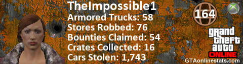 [URL=http://GTAonlinestats.com/showplayer/TheImpossible1][IMG]http://GTAonlinestats.com/crimesignature/TheImpossible1/sig.png[/IMG][/URL]