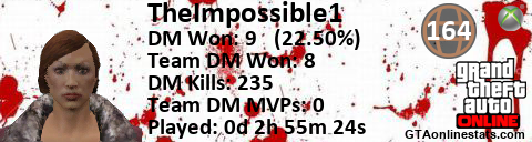 <a href="http://GTAonlinestats.com/showplayer/TheImpossible1"><img src="http://GTAonlinestats.com/dmsignature/TheImpossible1/sig.png" alt="TheImpossible1" border="0" /></a>
