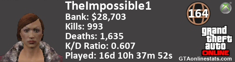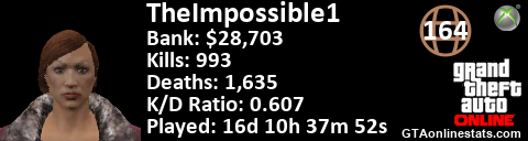 <a href="http://GTAonlinestats.com/showplayer/TheImpossible1"><img src="http://GTAonlinestats.com/signature/TheImpossible1/sig.png" alt="TheImpossible1" border="0" /></a>