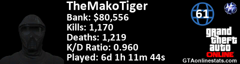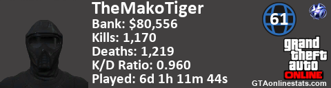 <a href="http://GTAonlinestats.com/showplayer/TheMakoTiger/2"><img src="http://GTAonlinestats.com/dmsignature/TheMakoTiger/2/sig.png" alt="TheMakoTiger" border="0" /></a>