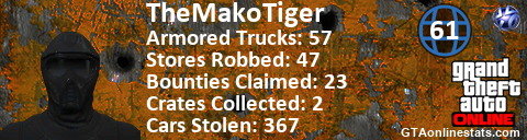 [URL=http://GTAonlinestats.com/showplayer/TheMakoTiger/2][IMG]http://GTAonlinestats.com/crimesignature/TheMakoTiger/2/sig.png[/IMG][/URL]