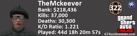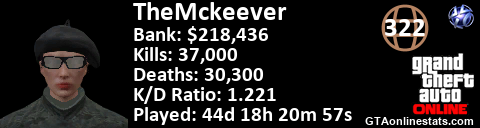 [URL=http://GTAonlinestats.com/showplayer/TheMckeever][IMG]http://GTAonlinestats.com/signature/TheMckeever/sig.png[/IMG][/URL]