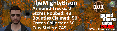 [URL=http://GTAonlinestats.com/showplayer/TheMightyBison][IMG]http://GTAonlinestats.com/crimesignature/TheMightyBison/sig.png[/IMG][/URL]