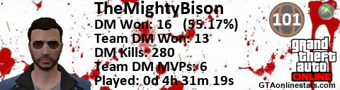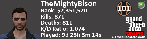 [URL=http://GTAonlinestats.com/showplayer/TheMightyBison][IMG]http://GTAonlinestats.com/signature/TheMightyBison/sig.png[/IMG][/URL]