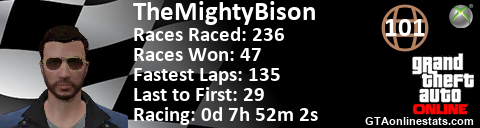 [URL=http://GTAonlinestats.com/showplayer/TheMightyBison][IMG]http://GTAonlinestats.com/racesignature/TheMightyBison/sig.png[/IMG][/URL]
