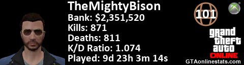 <a href="http://GTAonlinestats.com/showplayer/TheMightyBison"><img src="http://GTAonlinestats.com/randomsignature/TheMightyBison/sig.png" alt="TheMightyBison" border="0" /></a>