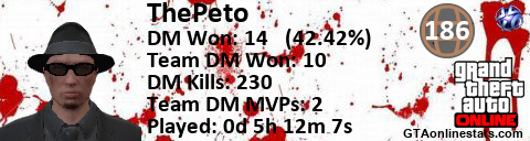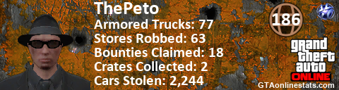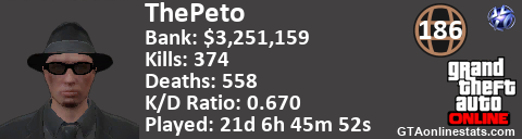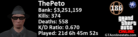 [URL=http://GTAonlinestats.com/showplayer/ThePeto][IMG]http://GTAonlinestats.com/signature/ThePeto/sig.png[/IMG][/URL]