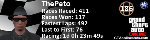 <a href="http://GTAonlinestats.com/showplayer/ThePeto"><img src="http://GTAonlinestats.com/racesignature/ThePeto/sig.png" alt="ThePeto" border="0" /></a>