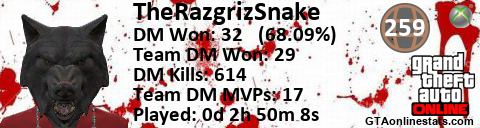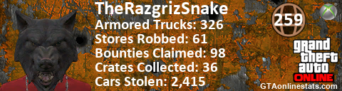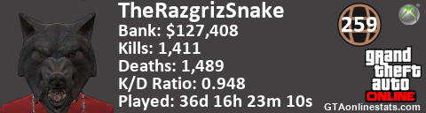 [URL=http://GTAonlinestats.com/showplayer/TheRazgrizSnake][IMG]http://GTAonlinestats.com/signature/TheRazgrizSnake/sig.png[/IMG][/URL]
