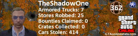 [URL=http://GTAonlinestats.com/showplayer/TheShadowOne][IMG]http://GTAonlinestats.com/randomsignature/TheShadowOne/sig.png[/IMG][/URL]