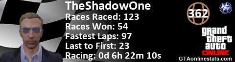 [URL=http://GTAonlinestats.com/showplayer/TheShadowOne][IMG]http://GTAonlinestats.com/racesignature/TheShadowOne/sig.png[/IMG][/URL]