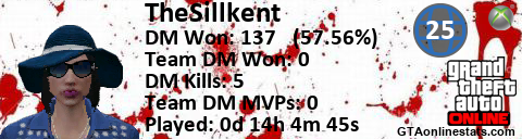 <a href="http://GTAonlinestats.com/showplayer/TheSillkent/2"><img src="http://GTAonlinestats.com/dmsignature/TheSillkent/2/sig.png" alt="TheSillkent" border="0" /></a>