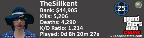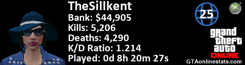 [URL=http://GTAonlinestats.com/showplayer/TheSillkent/2][IMG]http://GTAonlinestats.com/signature/TheSillkent/2/sig.png[/IMG][/URL]