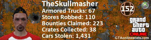 [URL=http://GTAonlinestats.com/showplayer/TheSkullmasher][IMG]http://GTAonlinestats.com/crimesignature/TheSkullmasher/sig.png[/IMG][/URL]