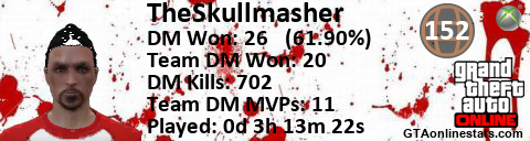 [URL=http://GTAonlinestats.com/showplayer/TheSkullmasher][IMG]http://GTAonlinestats.com/signature/TheSkullmasher/sig.png[/IMG][/URL]