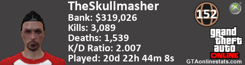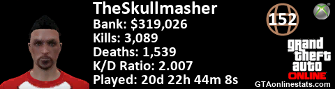 <a href="http://GTAonlinestats.com/showplayer/TheSkullmasher"><img src="http://GTAonlinestats.com/signature/TheSkullmasher/sig.png" alt="TheSkullmasher" border="0" /></a>
