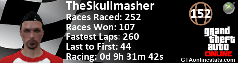 <a href="http://GTAonlinestats.com/showplayer/TheSkullmasher"><img src="http://GTAonlinestats.com/racesignature/TheSkullmasher/sig.png" alt="TheSkullmasher" border="0" /></a>