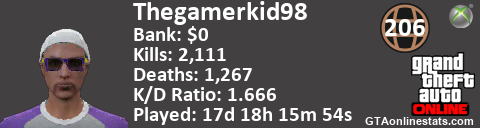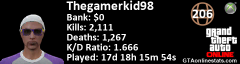 [URL=http://GTAonlinestats.com/showplayer/Thegamerkid98][IMG]http://GTAonlinestats.com/signature/Thegamerkid98/sig.png[/IMG][/URL]