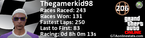 [URL=http://GTAonlinestats.com/showplayer/Thegamerkid98][IMG]http://GTAonlinestats.com/racesignature/Thegamerkid98/sig.png[/IMG][/URL]