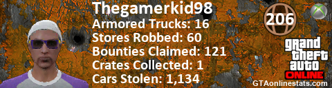 [URL=http://GTAonlinestats.com/showplayer/Thegamerkid98][IMG]http://GTAonlinestats.com/randomsignature/Thegamerkid98/sig.png[/IMG][/URL]