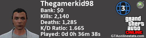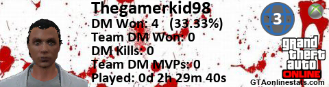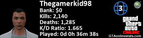 [URL=http://GTAonlinestats.com/showplayer/Thegamerkid98/2][IMG]http://GTAonlinestats.com/dmsignature/Thegamerkid98/2/sig.png[/IMG][/URL]