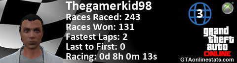 [URL=http://GTAonlinestats.com/showplayer/Thegamerkid98/2][IMG]http://GTAonlinestats.com/racesignature/Thegamerkid98/2/sig.png[/IMG][/URL]