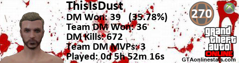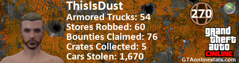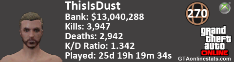 <a href="http://GTAonlinestats.com/showplayer/ThisIsDust"><img src="http://GTAonlinestats.com/dmsignature/ThisIsDust/sig.png" alt="ThisIsDust" border="0" /></a>