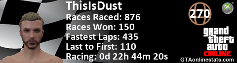 <a href="http://GTAonlinestats.com/showplayer/ThisIsDust"><img src="http://GTAonlinestats.com/racesignature/ThisIsDust/sig.png" alt="ThisIsDust" border="0" /></a>