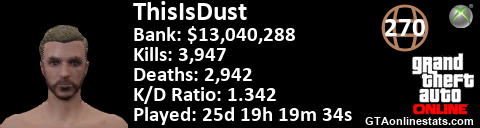 <a href="http://GTAonlinestats.com/showplayer/ThisIsDust"><img src="http://GTAonlinestats.com/greysignature/ThisIsDust/sig.png" alt="ThisIsDust" border="0" /></a>