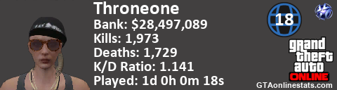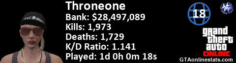 [URL=http://GTAonlinestats.com/showplayer/Throneone/2][IMG]http://GTAonlinestats.com/signature/Throneone/2/sig.png[/IMG][/URL]
