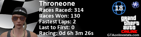 <a href="http://GTAonlinestats.com/showplayer/Throneone/2"><img src="http://GTAonlinestats.com/racesignature/Throneone/2/sig.png" alt="Throneone" border="0" /></a>