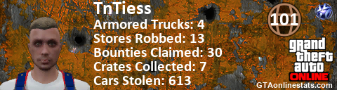 [URL=http://GTAonlinestats.com/showplayer/TnTiess][IMG]http://GTAonlinestats.com/randomsignature/TnTiess/sig.png[/IMG][/URL]