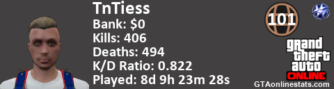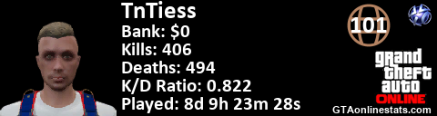 [URL=http://GTAonlinestats.com/showplayer/TnTiess][IMG]http://GTAonlinestats.com/signature/TnTiess/sig.png[/IMG][/URL]