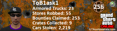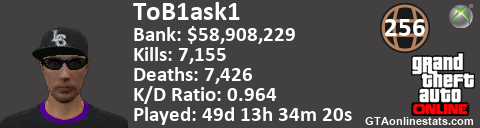 [URL=http://GTAonlinestats.com/showplayer/ToB1ask1][IMG]http://GTAonlinestats.com/signature/ToB1ask1/sig.png[/IMG][/URL]