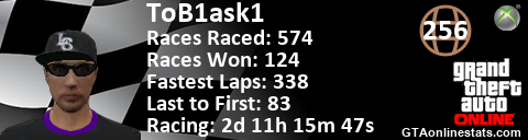 <a href="http://GTAonlinestats.com/showplayer/ToB1ask1"><img src="http://GTAonlinestats.com/racesignature/ToB1ask1/sig.png" alt="ToB1ask1" border="0" /></a>